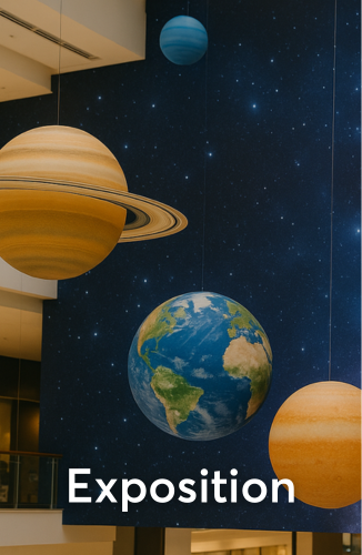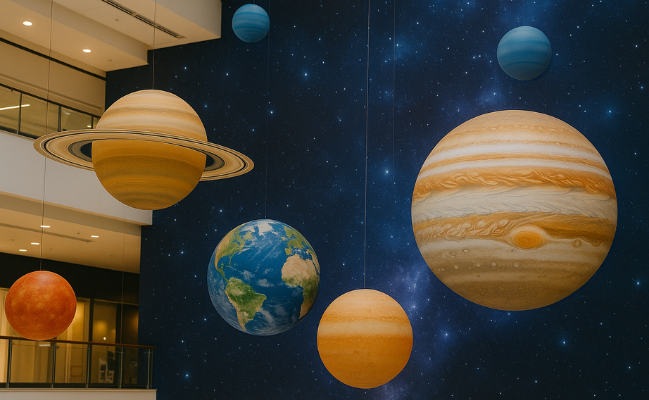 Levez les yeux et laissez-vous émerveiller par notre spectaculaire système solaire gonflable suspendu ! Plongé au cœur des planètes géantes, vous pourrez admirer Saturne, Jupiter, la Terre et leurs voisines dans une mise en scène impressionnante et immersive. Une exposition visuelle et éducative qui vous invite à voyager dans l’espace… sans quitter le sol du centre commercial.